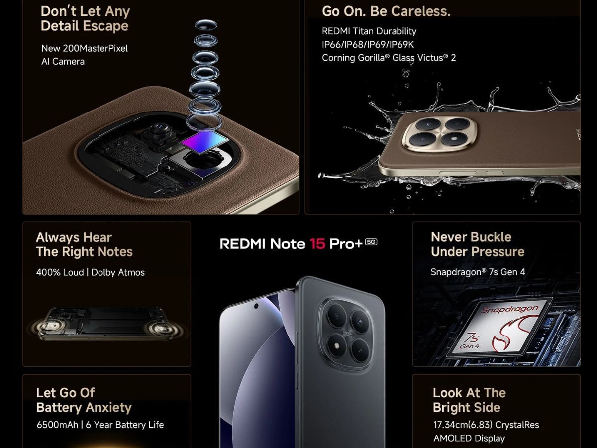इस सीरीज का सबसे प्रीमियम मॉडल रेडमी नोट 15 प्रो+ 5जी (Redmi Note 15 Pro+ 5G) लेटेस्ट स्नैपड्रैगन 7s जेन 4 (Snapdragon 7s Gen 4) चिपसेट से लैस है. इसमें 12GB तक की रैम और 512GB तक की इंटरनल स्टोरेज दी गई है, जो इसे मल्टीटास्किंग और गेमिंग के लिए एक बेहतरीन विकल्प बनाती है. रेडमी नोट 15 प्रो+ 5जी (Redmi Note 15 Pro+ 5G) में 6.83-इंच का क्रिस्टल-रेस एमोलेड (CrystalRes AMOLED) डिस्प्ले है, जो 1.5K रेजोल्यूशन और 120Hz रिफ्रेश रेट के साथ आता है. 3200 निट्स की जबरदस्त ब्राइटनेस के कारण इसे तेज धूप में भी आसानी से इस्तेमाल किया जा सकता है.