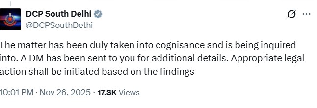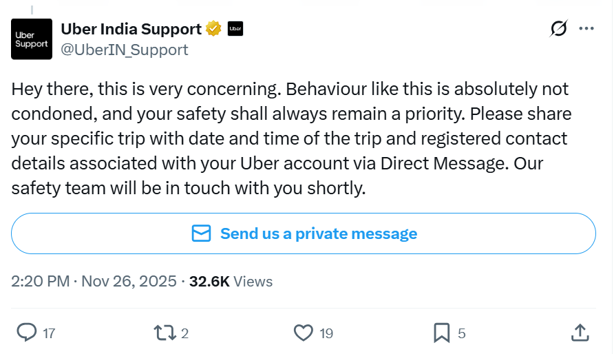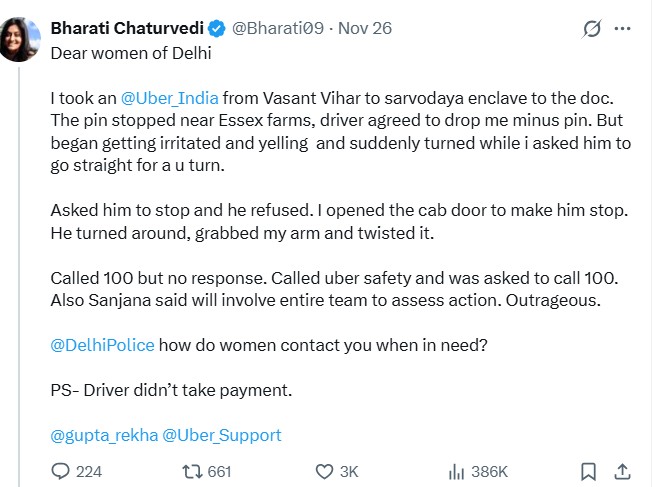 पोस्ट वायरल होने के बाद उबर और पुलिस ने प्रतिक्रिया दी। उबर ने कहा कि ऐसे व्यवहार को मंजूर नहीं किया जाएगा और सुरक्षा उनकी प्राथमिकता है। दक्षिण दिल्ली पुलिस ने बताया कि शिकायत दर्ज होने के बाद मामले की जांच की जा रही है।
