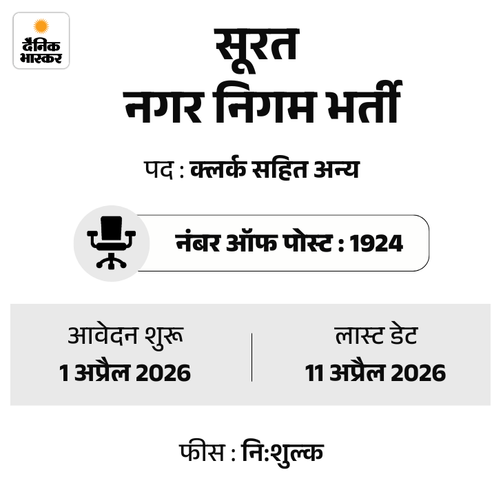 साथ ही सूरत नगर निगम में 1924 पदों पर भर्ती के लिए लास्ट डेट करीब। उम्मीदवारों को 11 अप्रैल तक आवेदन का मौका दिया जाएगा।