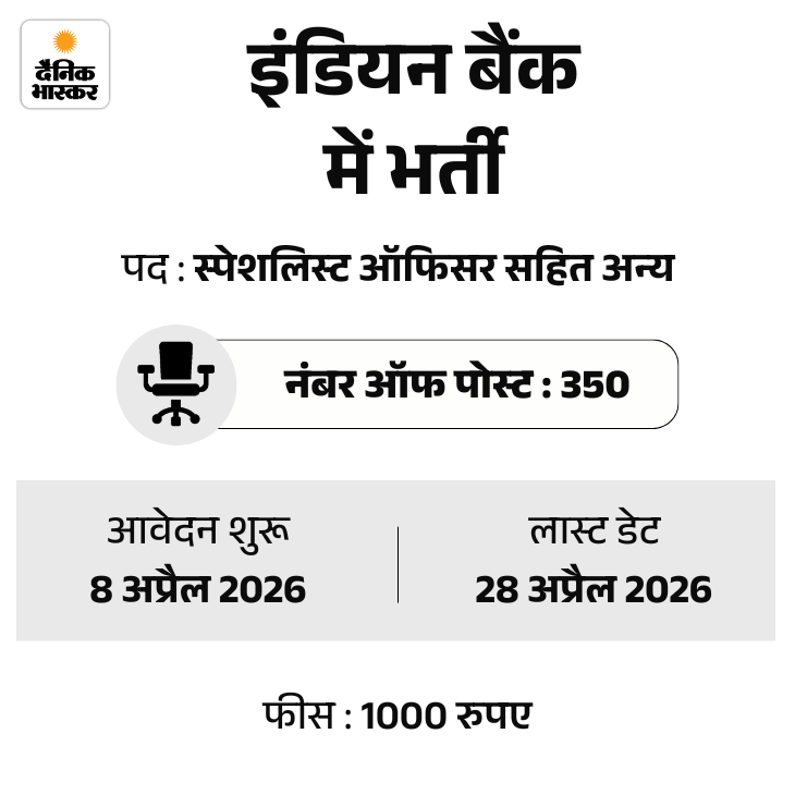 इंडियन बैंक में स्पेशलिस्ट ऑफिसर के 350 पदों पर भर्ती निकली है। उम्मीदवार ऑनलाइन मोड में ऑफिशियल वेबसाइट indianbank.in पर जाकर आवेदन कर सकते हैं।