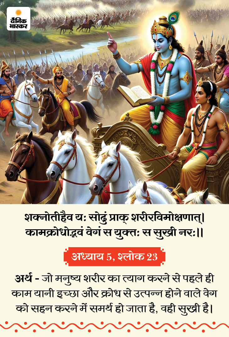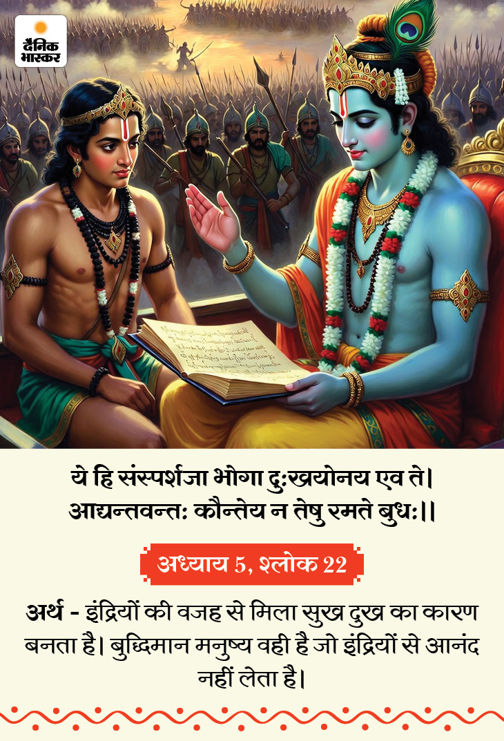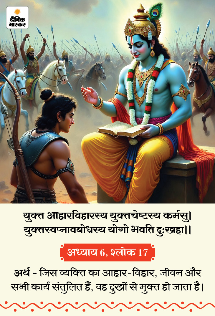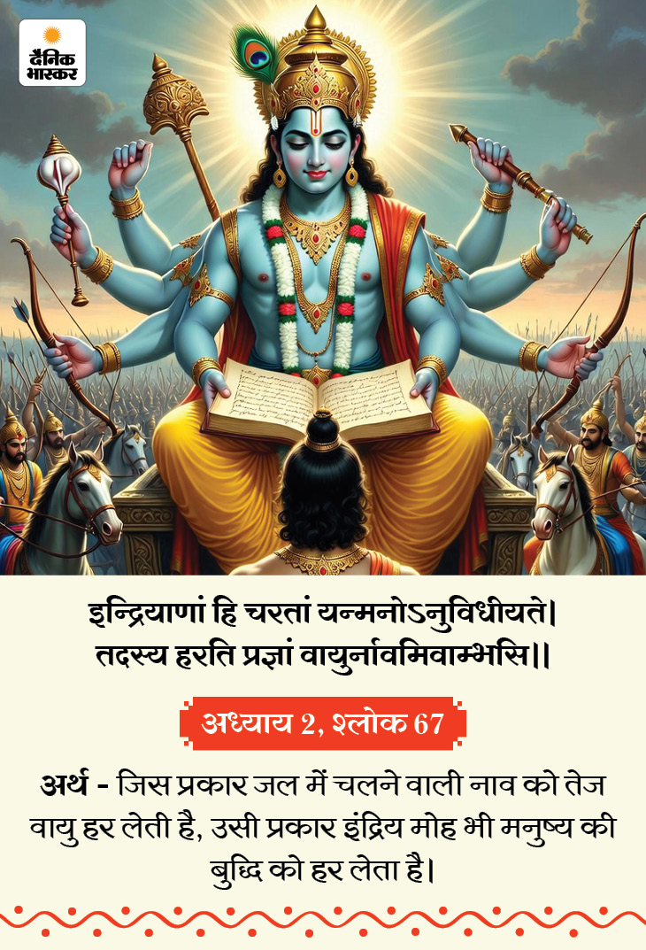 आज (सोमवार, 1 दिसंबर) गीता जयंती है, आज मोक्षदा एकादशी व्रत है। मान्यता है कि द्वापर युग में मार्गशीर्ष मास के शुक्ल पक्ष की एकादशी पर महाभारत के युद्धभूमि में श्रीकृष्ण ने अर्जुन को जीवन का सार समझाते हुए गीता का ज्ञान दिया था। गीता के उपदेश जीवन के हर क्षेत्र को संतुलित और सरल बना सकते हैं। इन्हें अपनाने से मन की उलझनें दूर होती हैं, कर्तव्य के प्रति स्पष्टता मिलती है और व्यक्ति कठिन परिस्थितियों में भी धैर्य और विवेक बनाए रख सकता है। जानिए गीता कुछ खास सूत्र, जिन्हें अपनाने से हमारी सभी समस्याएं दूर हो सकती हैं…