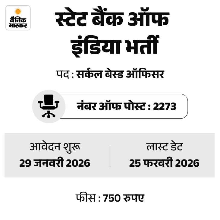 स्टेट बैंक ऑफ इंडिया यानी SBI की ओर से सर्कल बेस्ड ऑफिसर के 2273 पदों पर भर्ती निकली है। इस वैकेंसी के लिए आवेदन की आखिरी तारीख 18 फरवरी थी जिसे 25 फरवरी 2026 तक के लिए एक्सटेंड किया गया है।