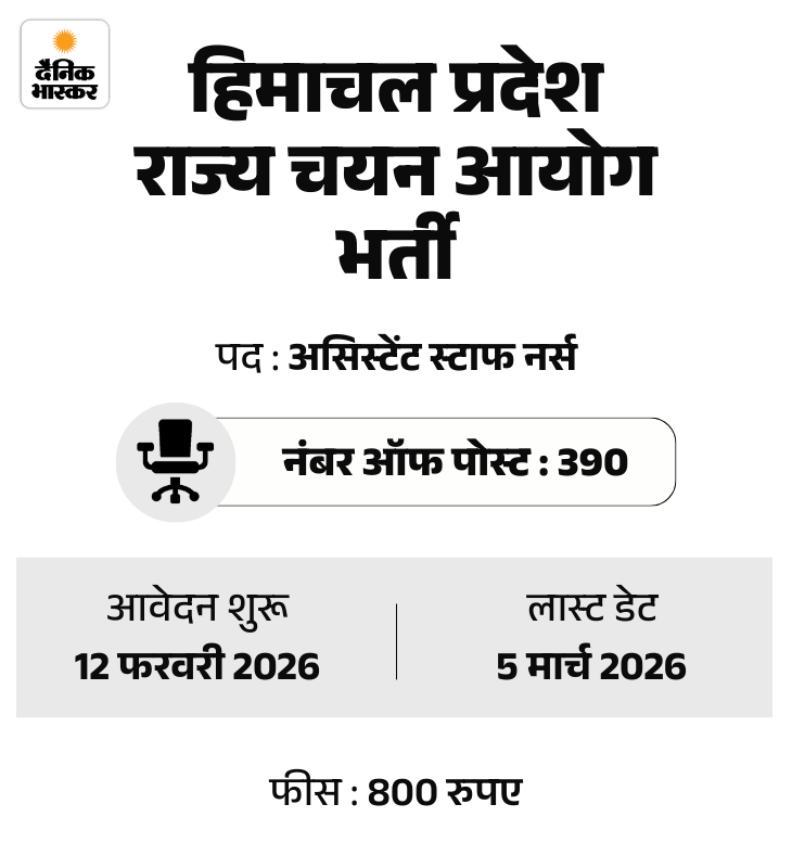 हिमाचल प्रदेश राज्य चयन आयोग (HPRCA) ने असिस्टेंट स्टाफ नर्स के पदों पर भर्ती निकाली है। इस भर्ती के लिए आवेदन की प्रक्रिया आज यानी 12 फरवरी 2026 से शुरू हो रही है। उम्मीदवार ऑफिशियल वेबसाइट पर जाकर आवेदन कर सकेंगे। फॉर्म में करेक्शन के लिए 100 रुपए देना होंगे।