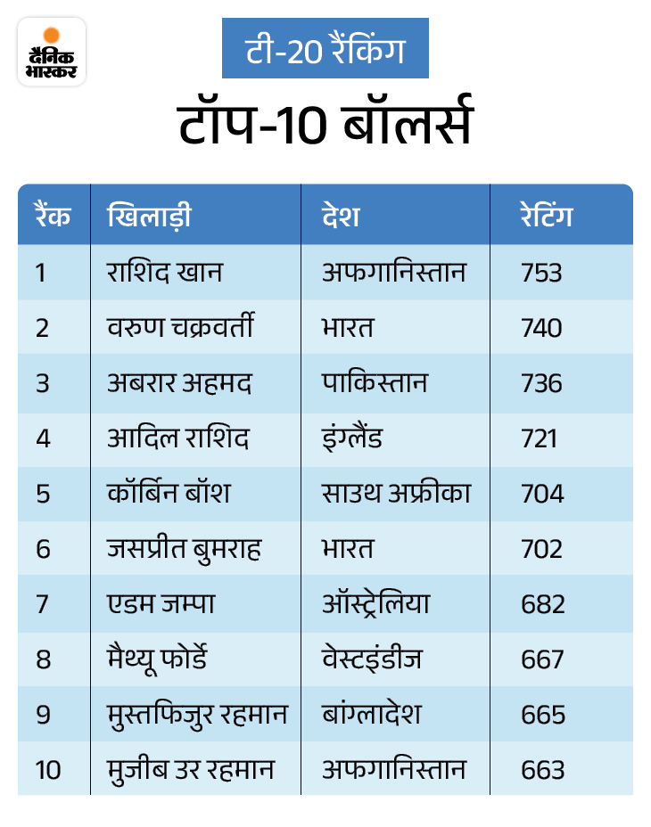 गेंदबाजों की रैंकिंग में अफगानिस्तान के राशिद खान 753 रेटिंग के साथ पहले नंबर पर हैं। भारत के वरुण चक्रवर्ती दूसरे और पाकिस्तान के अबरार अहमद तीसरे स्थान पर हैं।टॉप-10 में भारत के जसप्रीत बुमराह भी शामिल हैं।