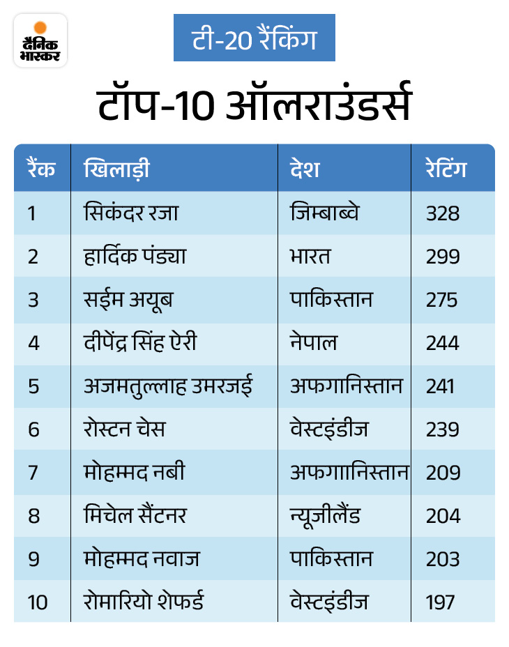 ऑलराउंडर रैंकिंग में जिम्बाब्वे के सिकंदर रजा 328 रेटिंग के साथ पहले नंबर पर हैं। भारत के हार्दिक पंड्या 299 रेटिंग के साथ दूसरे स्थान पर बने हुए हैं। पाकिस्तान के सैम अयूब तीसरे और नेपाल के दीपेंद्र सिंह ऐरी चौथे नंबर पर हैं।