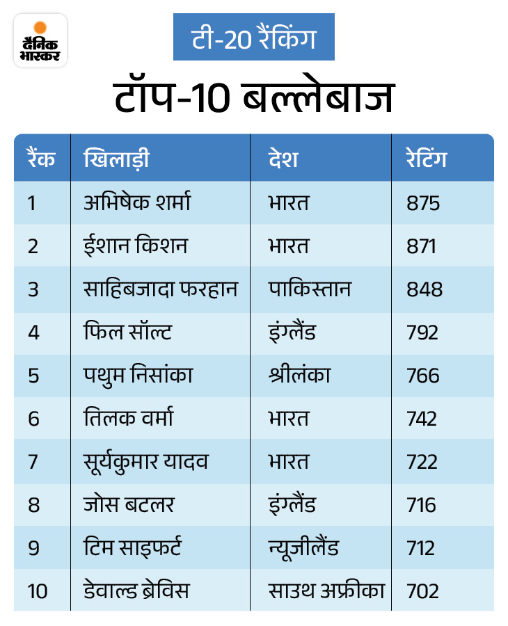 टी-20 बल्लेबाजों की रैंकिंग में अभिषेक शर्मा 875 रेटिंग के साथ पहले नंबर पर हैं। दूसरे नंबर पर भी भारत के ईशान किशन हैं। टॉप-10 में भारत के कुल 4 बल्लेबाज शामिल हैं। इसमें तिलक वर्मा और सूर्यकुमार यादव भी जगह बनाने में सफल रहे हैं। पाकिस्तान के साहिबजादा फरहान तीसरे नंबर पर हैं, जबकि इंग्लैंड के फिल सॉल्ट चौथे स्थान पर हैं।