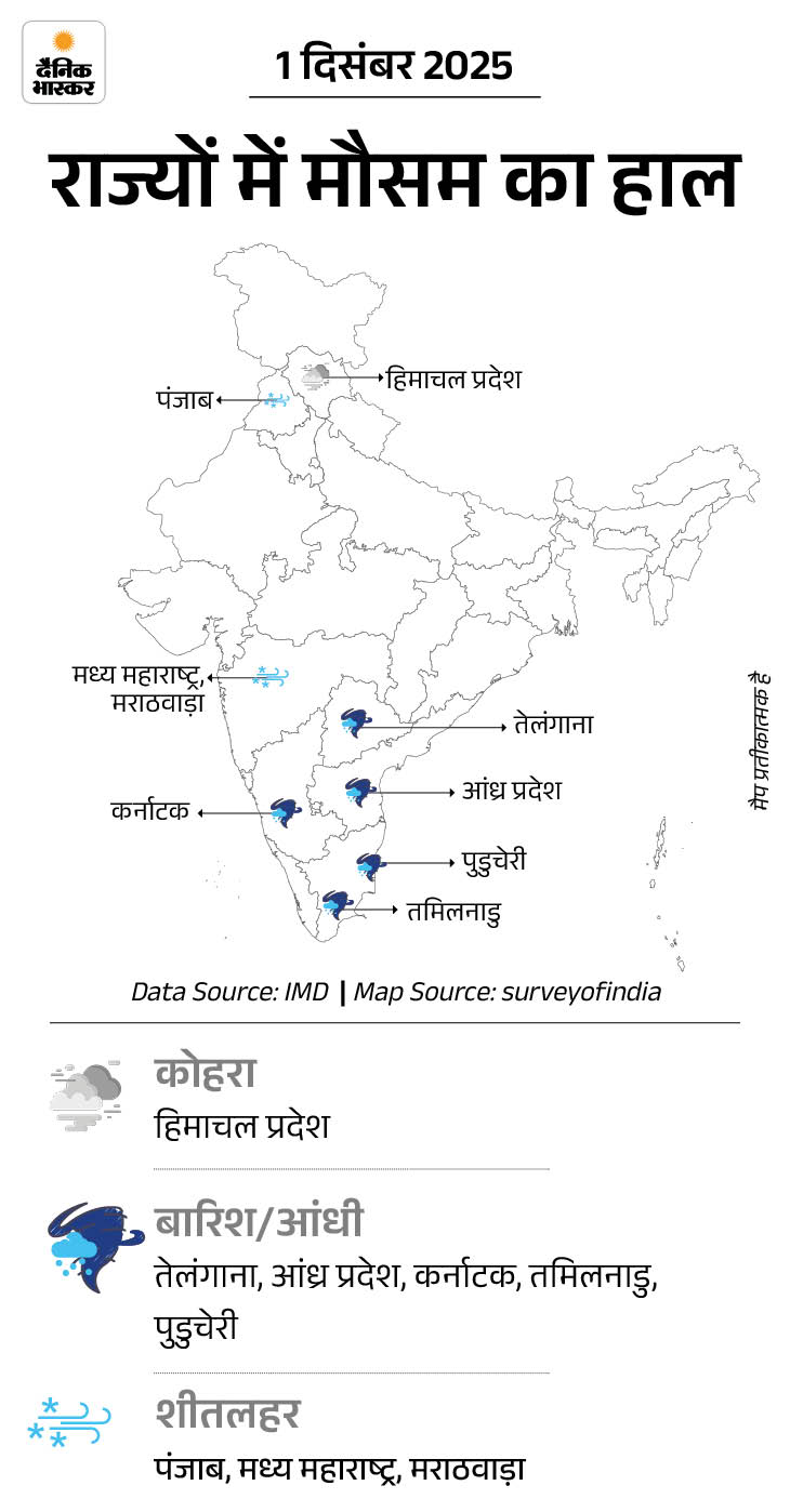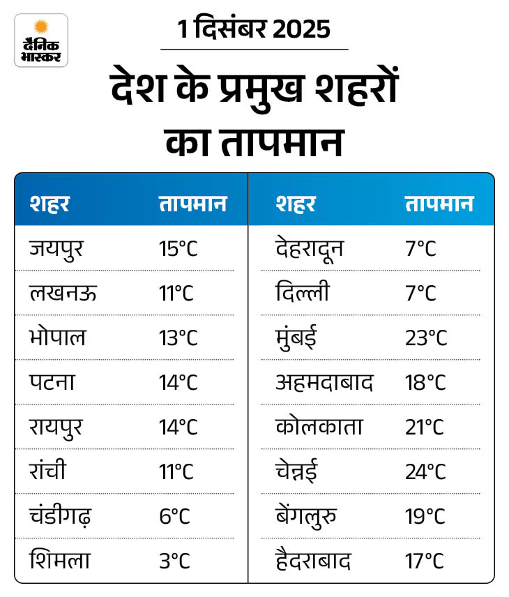 उत्तर भारत के पहाड़ी राज्यों पर एक वेस्टर्न डिस्टरबेंस एक्टिव है, इसके कारण फिलहाल उत्तरी हवाएं कमजोर हैं। लेकिन 2-3 दिसंबर के बाद, जब यह सिस्टम आगे बढ़ जाएगा तब फिर से बर्फीली हवाएं चलने लगेंगी।