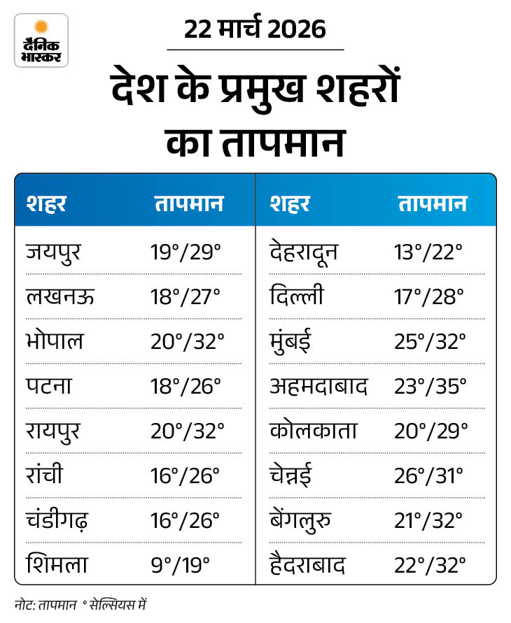 - 23 मार्च- हिमाचल प्रदेश और उत्तराखंड में हल्की बारिश-बर्फबारी की आशंका। महाराष्ट्र में हल्की बारिश की संभावना।