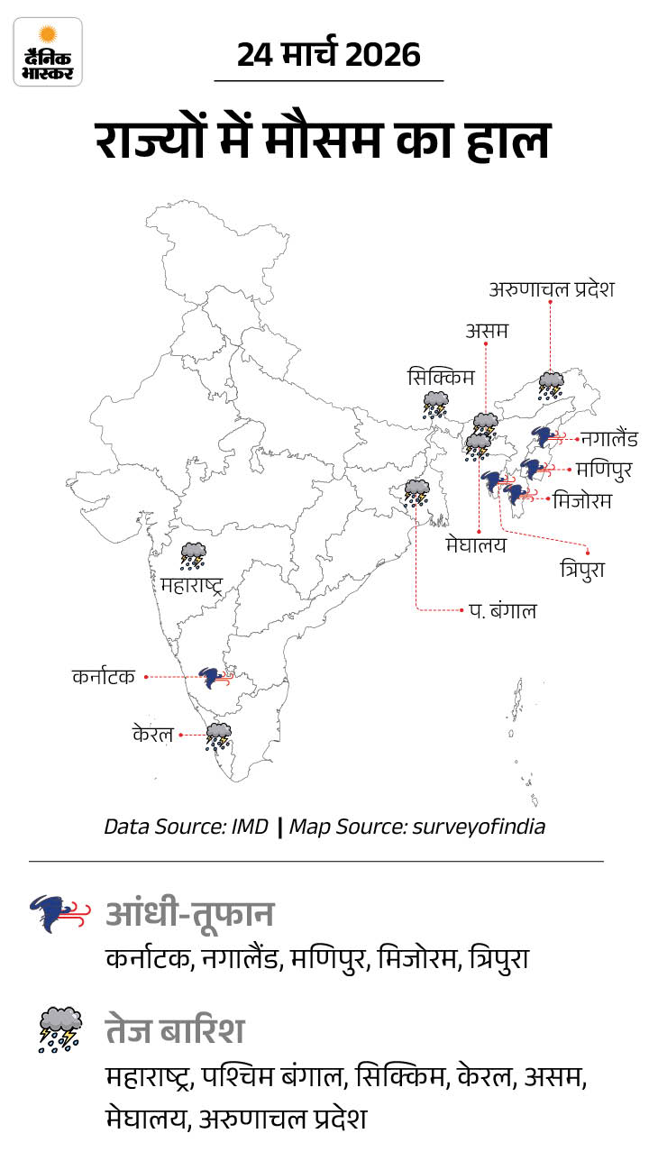 - 25 मार्च- अरुणाचल प्रदेश, असम, मेघालय, नागालैंड, मणिपुर, मिजोरम और त्रिपुरा में बिजली गिरने की आशंका है। कर्नाटक, आंध्र प्रदेश, महाराष्ट्र, बंगाल और सिक्किम में हल्की बारिश की संभावना।