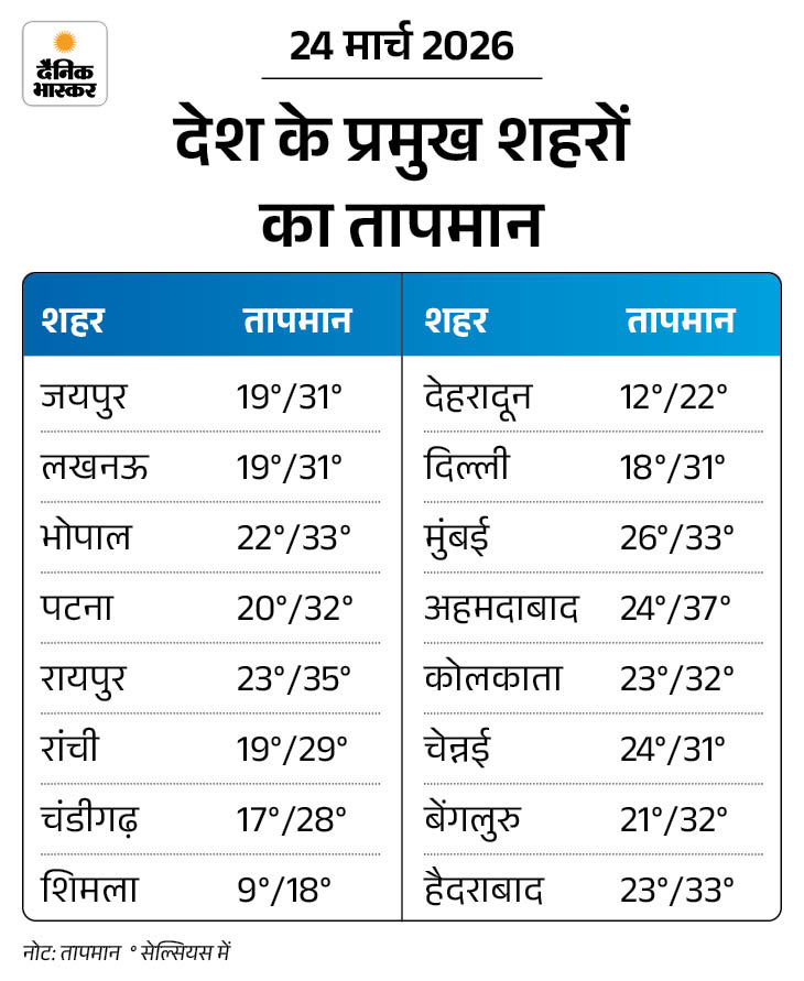 - 26 मार्च- मध्य भारत, बिहार, कर्नाटक और आंध्र प्रदेश में हल्की बारिश की संभावना है।