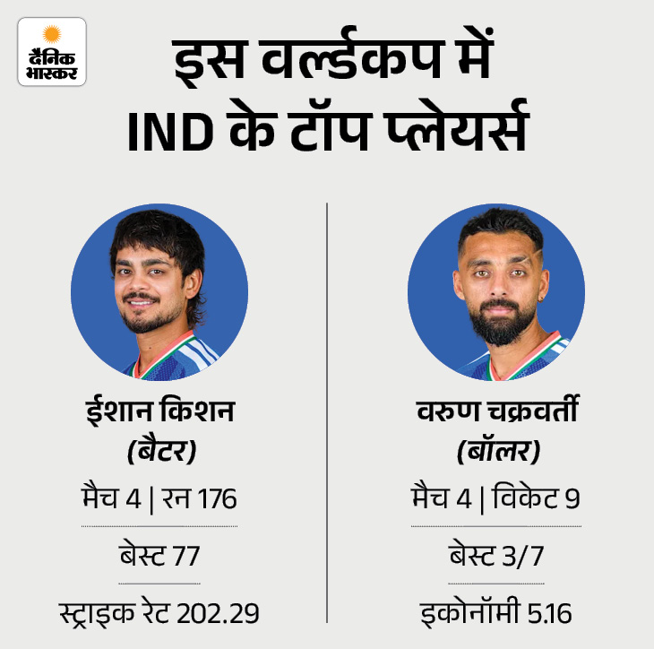 इस वर्ल्ड कप में भारतीय टीम के लिए ईशान किशन और वरुण चक्रवर्ती बेहतरीन प्रदर्शन कर रहे हैं। ईशान ने 4 मैचों में 176 रन बनाए हैं, जिसमें उनका बेस्ट स्कोर 77 रन रहा है। वहीं, वरुण ने गेंदबाजी में कमाल दिखाते हुए 4 मैचों में 9 विकेट झटके हैं।