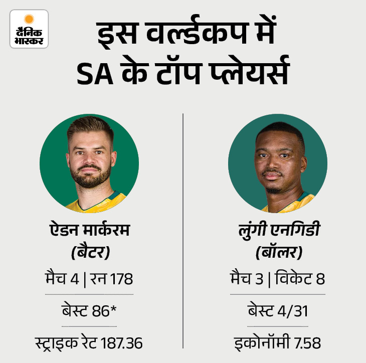 इस वर्ल्ड कप में साउथ अफ्रीका के लिए कप्तान ऐडन मार्करम बल्ले से शानदार लय में दिखे हैं। उन्होंने 4 मुकाबलों में 178 रन बनाए हैं, जिसमें नाबाद 86 रन उनकी बेस्ट पारी रही। वहीं गेंदबाजी में लुंगी एनगिडी ने अहम भूमिका निभाई है। उन्होंने 3 मैचों में 8 विकेट चटकाए हैं।