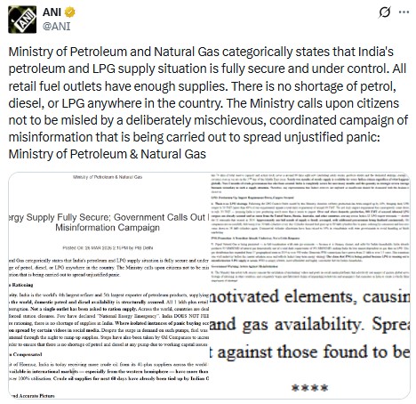 वहीं, सरकार ने देश में पेट्रोल, डीजल और LPG (रसोई गैस) की कमी की खबरों को पूरी तरह से खारिज कर दिया है। पेट्रोलियम और प्राकृतिक गैस मंत्रालय ने नोटिफिकेशन जारी कर कहा कि दुनिया में कुछ भी हो जाए, भारत के पास 60 दिन का कच्चा तेल और ऑयल रिजर्व है।