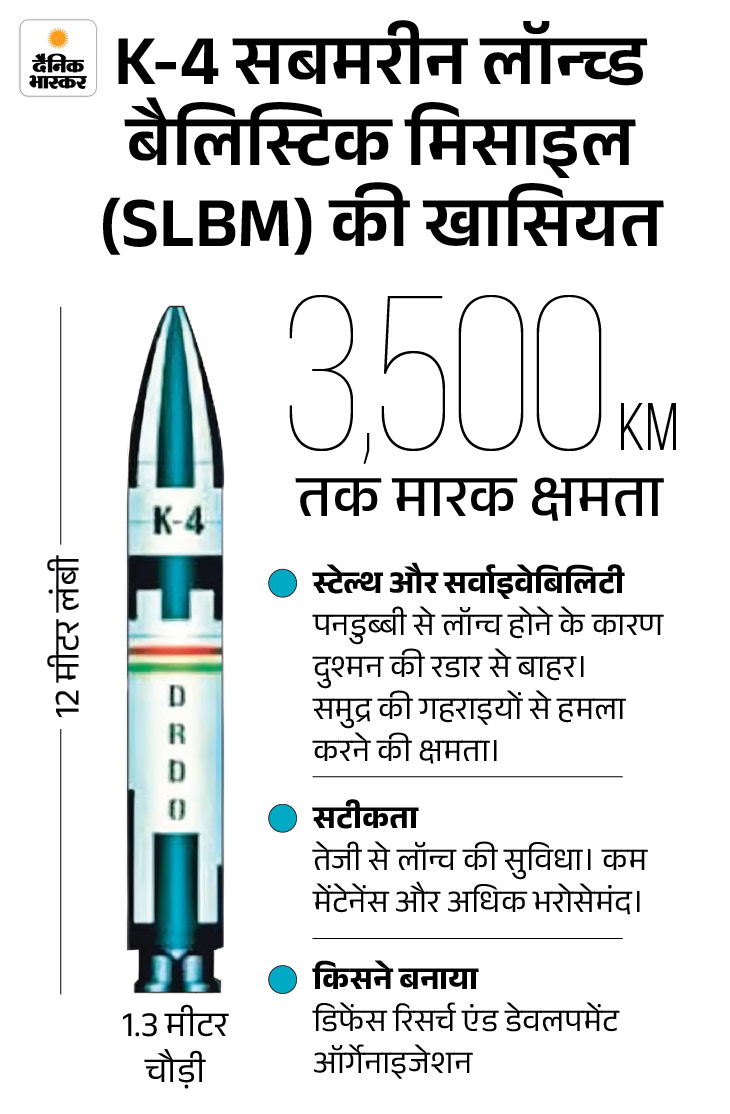 इस बीच, भारत ने बंगाल की खाड़ी में परमाणु क्षमता वाली K-4 बैलिस्टिक मिसाइल का सफल परीक्षण किया। रक्षा सूत्रों ने बताया कि मिसाइल को परमाणु चालित पनडुब्बी आईएनएस अरिघात से लॉन्च किया गया था। इसकी रेंज 3500 किमी है।