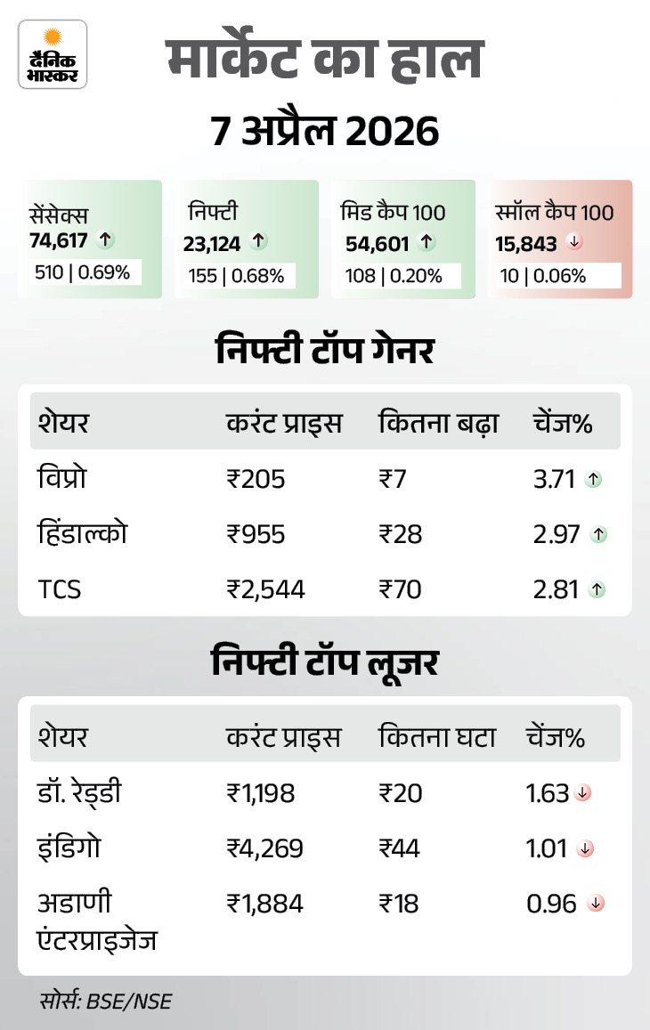 शेयर बाजार में कल 7 अप्रैल को लगातार चौथे दिन बढ़त रही थी। सेंसेक्स 510 अंक चढ़कर 74,617 पर बंद हुआ। निफ्टी में भी 155 अंक की तेजी रही, ये 23,124 पर बंद हुआ। आज IT, मेटल और रियल्टी शेयर्स में ज्यादा खरीदारी रही।