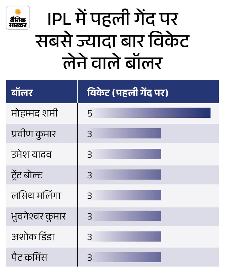 मोहम्मद शमी ने 5वीं बार अपनी पहली बॉल पर विकेट लिया। प्रवीण कुमार-उमेश यादव जैसे बॉलर्स ने 3-3 बार यह कारनामा किया है। खास बात यह है कि शमी ने दो अलग-अलग टीमों के डेब्यू की पहली बॉल पर विकेट लिया।
