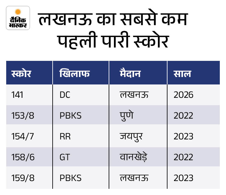 लखनऊ ने पहली पारी में अपना अब तक का सबसे कम स्कोर बनाया। टीम ने दिल्ली के खिलाफ 141 रन बनाए। इससे पहले यह रिकॉर्ड 153/8 का था, जो उन्होंने 2022 में पंजाब के खिलाफ पुणे में बनाया था।
