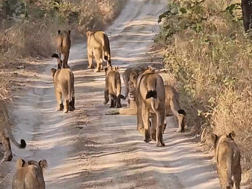 गुजरात के गिर में एक साथ दिखे 11 शेर, VIDEO:सफारी पर आए पर्यटकों के सामने से गुजरे