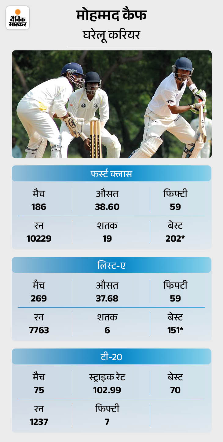 कैफ ने भारत के लिए 125 वनडे में करीब 32 की औसत से 2753 रन बनाए। इनमें उन्होंने 2 सेंचुरी और 17 फिफ्टी लगाईं। उन्होंने 2002 में वनडे डेब्यू के 2 साल पहले भारत के लिए टेस्ट डेब्यू कर लिया था। हालांकि, इस फॉर्मेट में वे खुद को स्थापित नहीं कर सके। रेड बॉल क्रिकेट के 13 मुकाबलों में कैफ ने करीब 33 की औसत से 624 रन बनाए। इनमें एक शतक और 3 फिफ्टी शामिल रहीं। 2006 के बाद कैफ भारत के लिए कोई इंटरनेशनल नहीं खेल सके।