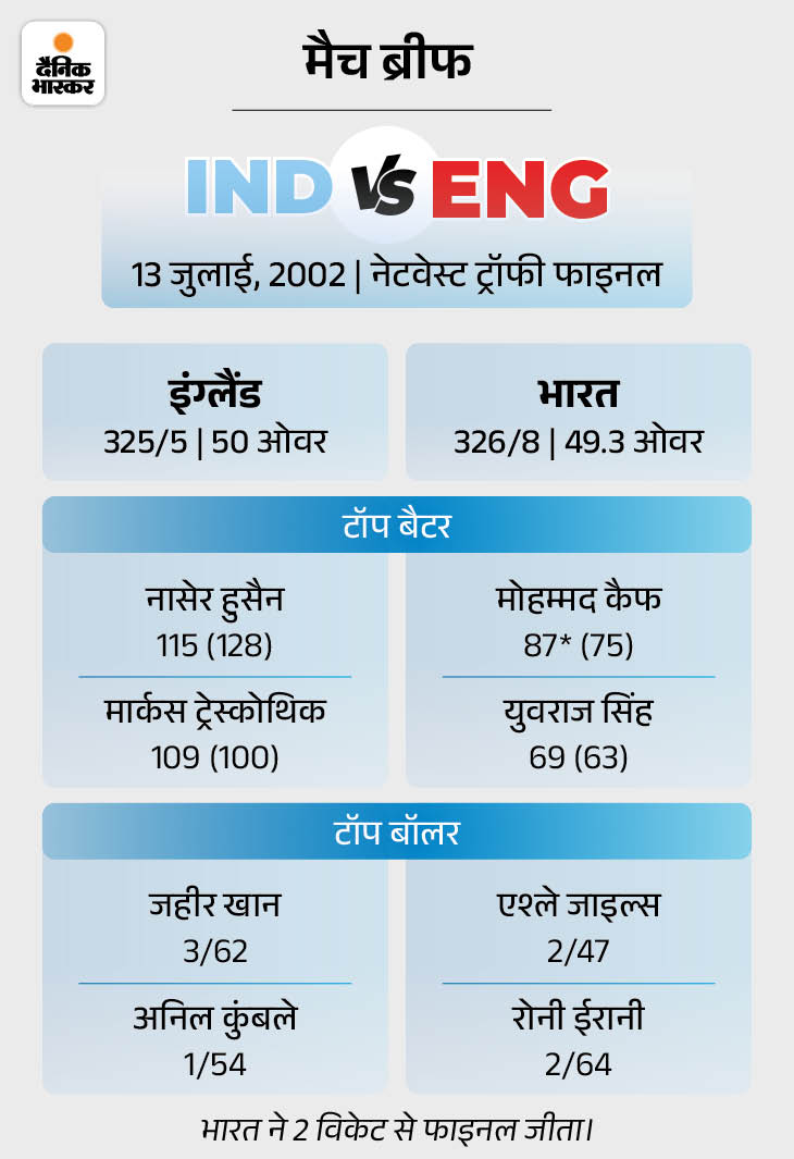 13 जुलाई 2002, भारत और इंग्लैंड के बीच लंदन के द लॉर्ड्स स्टेडियम में नेटवेस्ट ट्राई सीरीज का फाइनल हुआ। पहले बैटिंग करते हुए होम टीम ने 325 रन बना दिए। मार्कस ट्रेस्कोथिक और कप्तान नासेर हुसैन ने शतक लगाया। बड़े टारगेट के सामने भारत से वीरेंद्र सहवाग और कप्तान सौरव गांगुली ने सेंचुरी पार्टनरशिप कर ली।