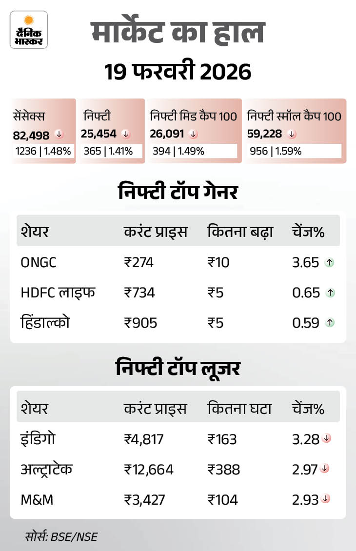 शेयर बाजार में कल यानी 19 फरवरी को गिरावट है। सेंसेक्स 1236 अंक (1.48%) की गिरावट के साथ 82,498 के स्तर पर बंद हुआ। निफ्टी में भी 365 अंक (1.41%) की गिरावट रही, ये 25,454 के स्तर पर बंद हुा। ऑटो, रियल्टी और बैंकिंग शेयर्स ज्यादा टूटे हैं।