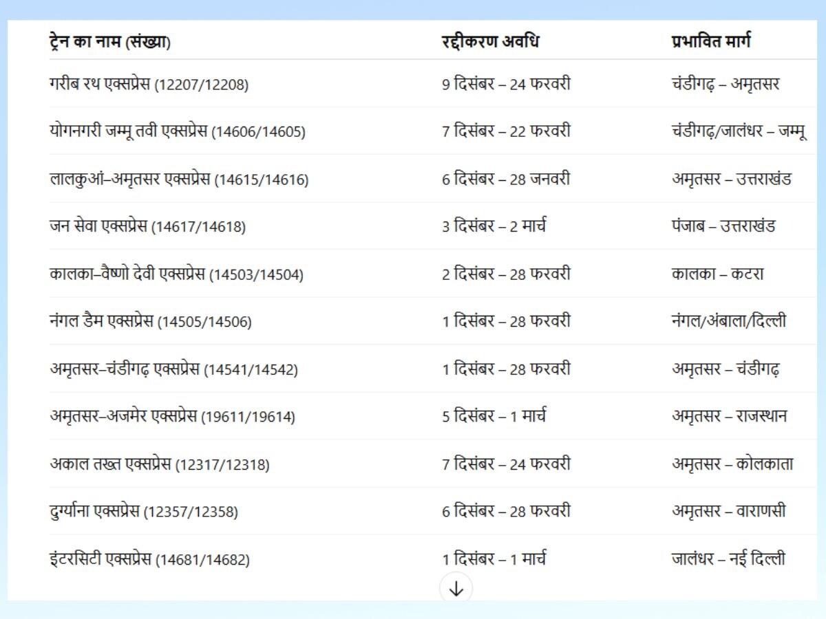 रद्द की गई ट्रेनों में कई लंबे रूट की ट्रेनें भी शामिल हैं, जिन पर त्योहारी सीजन और ठंड के महीनों में भारी भीड़ रहती है. इनमें गरीब रथ एक्सप्रेस (12207/12208) का नाम सबसे प्रमुख है, जिसे 9 दिसंबर से 24 फरवरी तक बंद किया जाएगा. यह ट्रेन चंडीगढ़ से अमृतसर के बीच चलती है. योगनगरी जम्मू तवी एक्सप्रेस (14606/14605) को भी 7 दिसंबर से 22 फरवरी तक रद्द कर दिया गया है. यह ट्रेन चंडीगढ़, जालंधर और जम्मू के बीच चलती है.