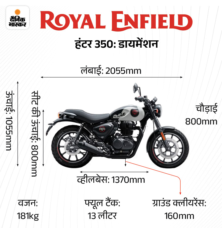 2025 रॉयल एनफील्ड हंटर 350 में 1370mm का व्हीलबेस मिलता है, जो मीटिओर से 30mm और क्लासिक 350 से 20mm छोटा है। बाइक क्लासिक 350 के मुकाबले 14kg हल्की है, इसका वजन 181 किलोग्राम है।
