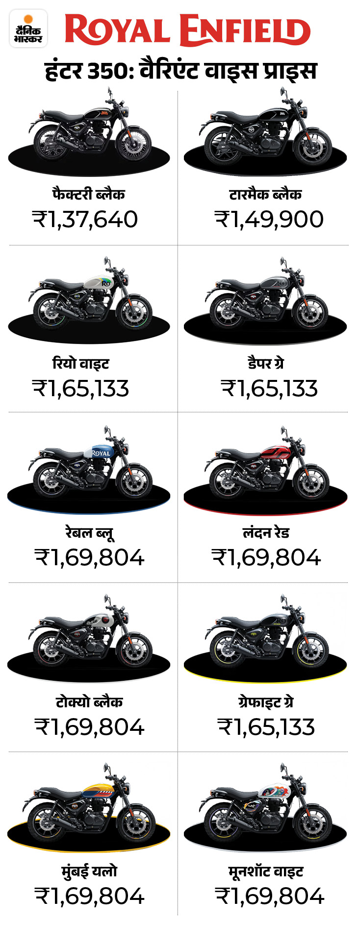 इसके साथ कंपनी ने हंटर के टॉप वैरिएंट के लिए दो नए और वाइब्रेंट कलर ऑप्शन भी पेश किए हैं। इसमें मुंबई येलो और मूनशॉट वाइट कलर शामिल हैं। इससे अब हंटर 10 कलर में अवेलेबल है। भारत में इसका मुकाबला TVS रोनिन, होंडा CB 350 और जावा 42 और येज्दी रोडस्टर जैसी बाइक्स से है।
