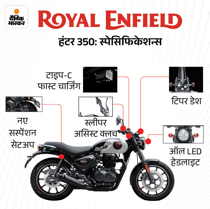 हंटर 350 में फोर्क कवर गैटर और एक ऑफसेट इंस्ट्रूमेंट क्लस्टर पहले की तरह ही मिलेगा। ये इंस्ट्रूमेंट क्लस्टर मीटिओर 350 और स्क्रैम 411 की तरह ही है। बाइक का स्विचगियर और ग्रिप भी मिटिओर जैसा ही दिखता है। रोडस्टर बाइक में USB पोर्ट मिलता है, इससे राइडिंग करते समय फोन भी चार्ज कर सकते हैं।