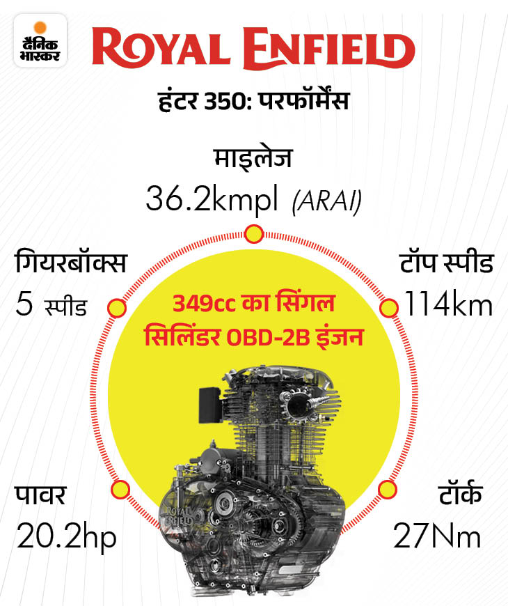 2025 रॉयल एनफील्ड हंटर 350 में कोई मैकेनिकल बदलान नहीं किया गया है। इसमें पहले की तरह ही 349cc का सिंगल-सिलेंडर, एयर/ऑयल-कूल्ड इंजन दिया गया है, जो नए एमिशन नॉर्म्स के अनुसार OBD2B फ्यूल इंजेक्शन तकनीक से लैस है। यानी बाइक E20 पेट्रोल पर भी चलेगी।