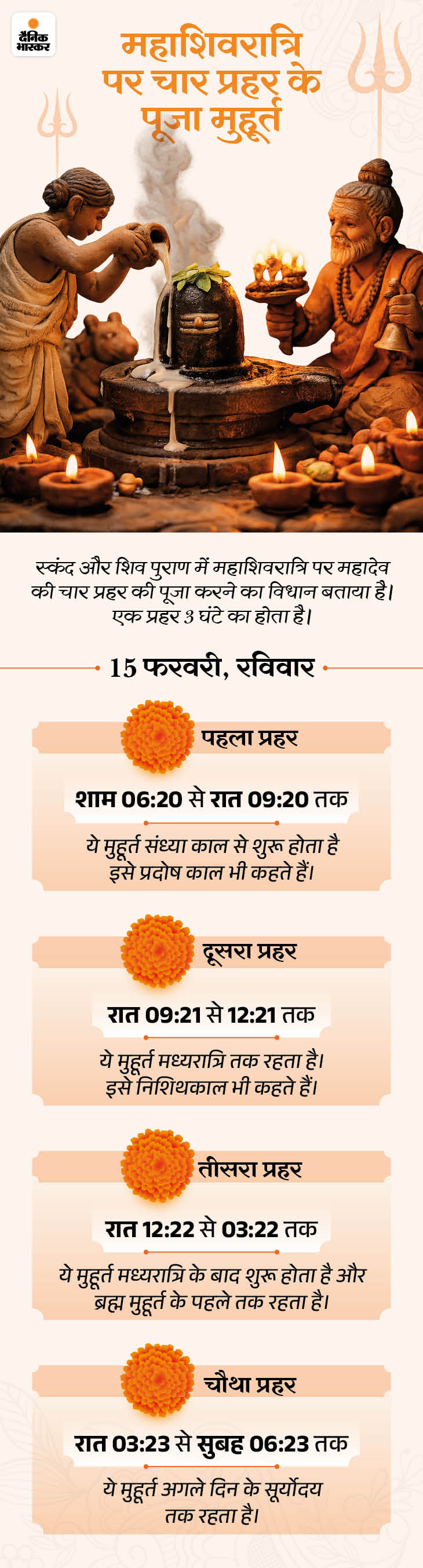 15 फरवरी को महाशिवरात्रि है। इस पर्व पर रात के चार प्रहर में शिव पूजा होती है। शिवरात्रि पूजा के मुहूर्त शाम 6.20 से शुरू हो रहे हैं। जानिए पूजा के लिए जरूरी चीजें, पूजा की आसान विधि और शिवरात्रि क्यों मनाते हैं, इससे जुड़ी तीन कहानियां।