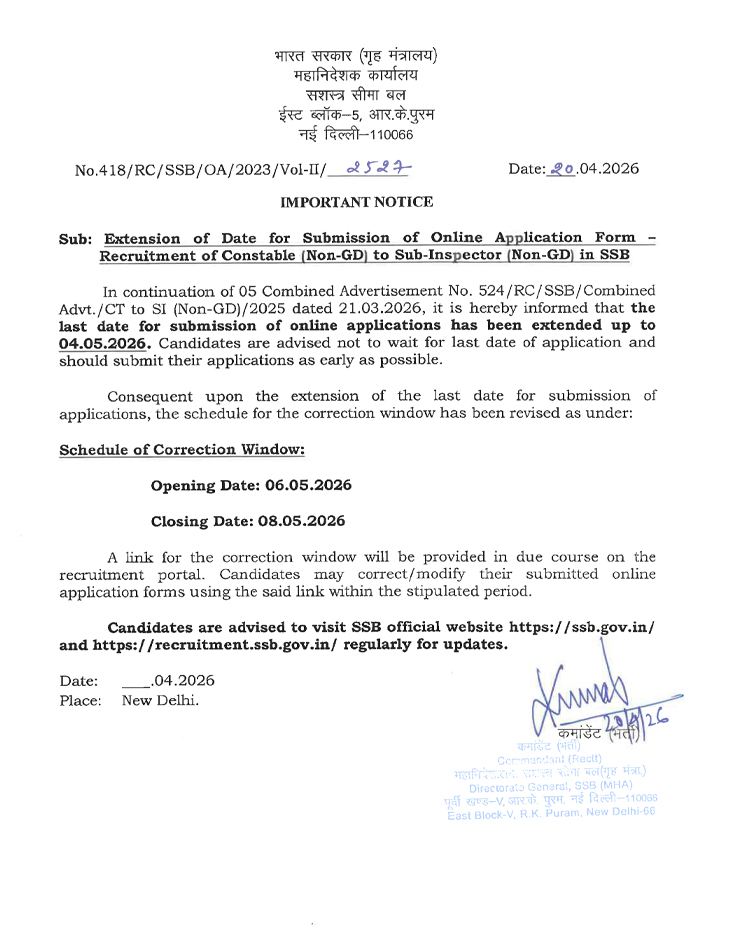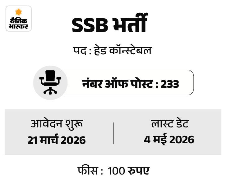 सशस्त्र सीमा बल (SSB) में हेड कॉन्स्टेबल के पदों पर भर्ती के लिए आवेदन करने की आखिरी तारीख बढ़ा दी गई है। अब उम्मीदवार 4 मई तक ऑफिशियल वेबसाइट ssb.gov.in पर जाकर अप्लाई कर सकते हैं।