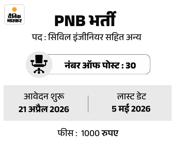पंजाब नेशनल बैंक में ऑफिस के 30 पदों पर भर्ती निकली है। उम्मीदवार ऑफिशियल वेबसाइट पर जाकर आवेदन कर सकते हैं।
