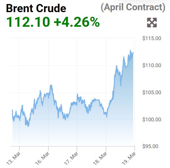 अमेरिका और इजराइल की ईरान के साथ जारी जंग के कारण कच्चे तेल की कीमतों में भारी उछाल आया है। फारस की खाड़ी से होने वाली सप्लाई रुकने की वजह से ग्लोबल बेंचमार्क ब्रेंट के दाम आज 4% से ज्यादा बढ़कर 112 डॉलर प्रति बैरल के पार निकल गए है।