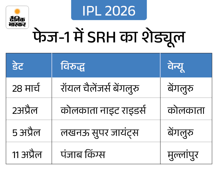 28 मार्च को RCB से होगा पहला मुकाबला सनराइजर्स हैदराबाद अपने अभियान की शुरुआत 28 मार्च को करेगी। सीजन के पहले ही मैच में उनका सामना डिफेंडिंग चैंपियन रॉयल चैलेंजर्स बेंगलुरु (RCB) से होगा। यह मैच बेंगलुरु के एम. चिन्नास्वामी स्टेडियम में खेला जाएगा। टीम अब जैक एडवर्ड्स के रिप्लेसमेंट की तलाश कर रही है, जिसकी घोषणा जल्द की जा सकती है।