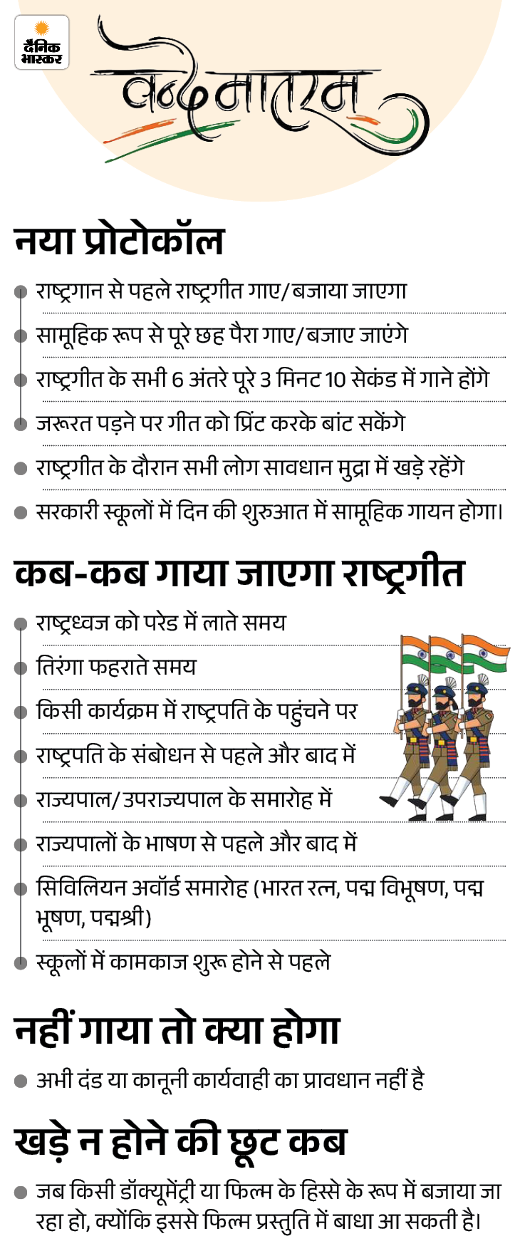 नए नियमों के अनुसार, राष्ट्रगीत के सभी 6 अंतरे गाए जाएंगे, जिनकी कुल अवधि 3 मिनट 10 सेकेंड है। अब तक मूल गीत के पहले दो अंतरे ही गाए जाते थे। पढ़ें पूरी खबर…