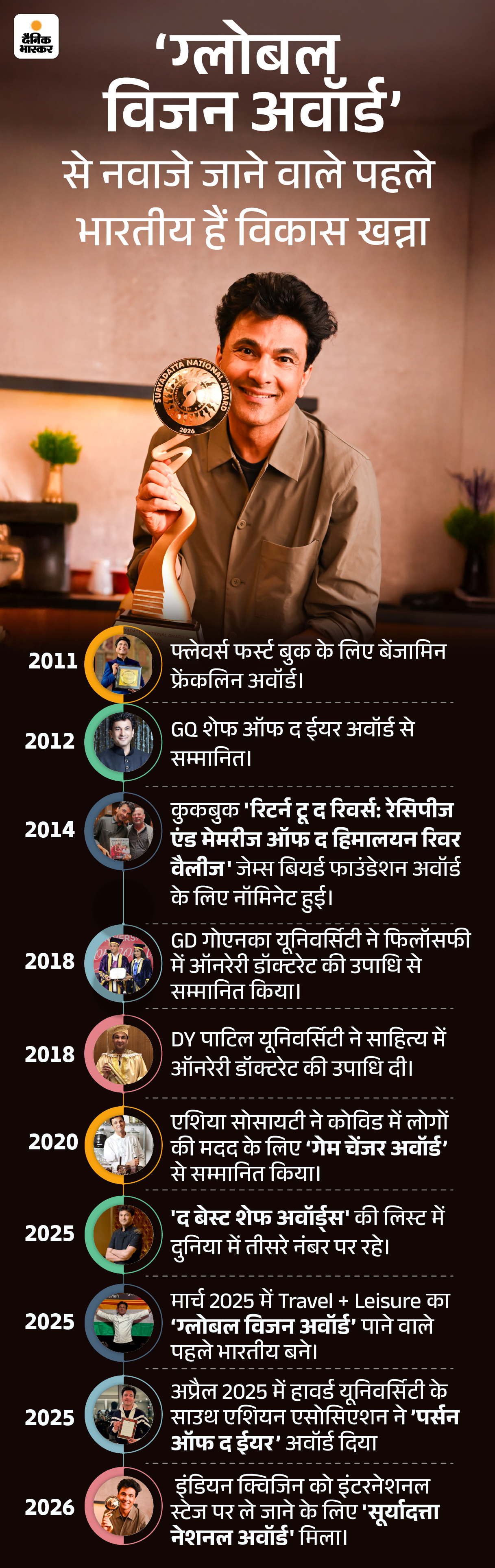 सेलिब्रिटी शेफ विकास खन्ना को TIME मैगजीन ने 2026 में दुनिया के 100 इन्फ्लुएंशल लोगों की लिस्ट में शामिल किया है। वे इस लिस्ट में शामिल 3 भारतीय मूल की हस्तियों में शामिल हैं।