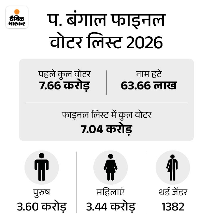 SIR प्रक्रिया के बाद अब तक 63.66 लाख नाम हटाए जा चुके हैं, जो कुल वोटरों का करीब 8.3% है। इससे वोटर बेस 7.66 करोड़ से घटकर 7.04 करोड़ रह गया है। वहीं, 60 लाख से ज्यादा वोटर अब भी ‘अंडर एडजुडिकेशन’ में हैं, जिन पर आगे फैसला होना है।